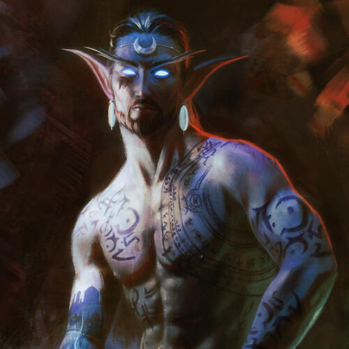 Hailing from an ancient lineage, he is a relic of a bygone era. Though he's a behemoth even amidst his own kin, there is unexpected gentleness in his taut muscles. They are a mosaic of magical symbols that ebb to life with a single breath. If not for them, he may be mistaken as part of the Sisterhood of Elune with his collection of moonstone jewelry. For years he was secluded in the harrowing halls of Eldre'thalas. Now he ventures Azeroth with abundant curiosity.